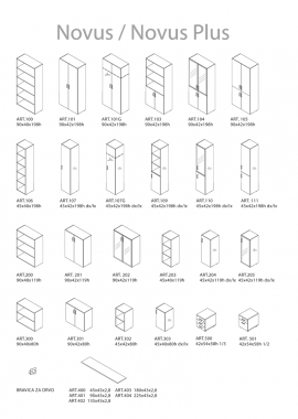Ormari i elementi Novus izrađuju se u standardnim širinama od 45 i 90 cm, dubine 40 cm a u visinama 198, 119 i 80 cm, ili dimenzijama po narudžbi.